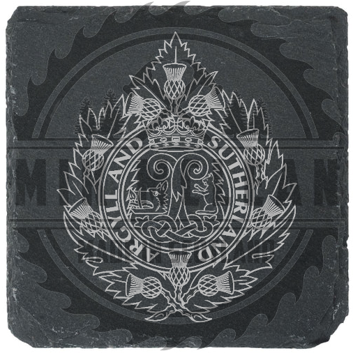 Celebrate Scottish heritage with this artisan-engraved 100mm square slate coaster from Mik McLean. Featuring the regal crest of the Argyll and Sutherland Highlanders, this design blends military tradition with botanical elegance — thistles, heraldic beasts, and a crowned shield etched in striking detail.