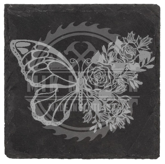 Grace meets grit in this artisan-engraved 100mm square slate coaster from Mik McLean. A delicate butterfly morphs into a blooming bouquet, blending symmetry and organic flourish in a design that celebrates transformation and natural beauty.