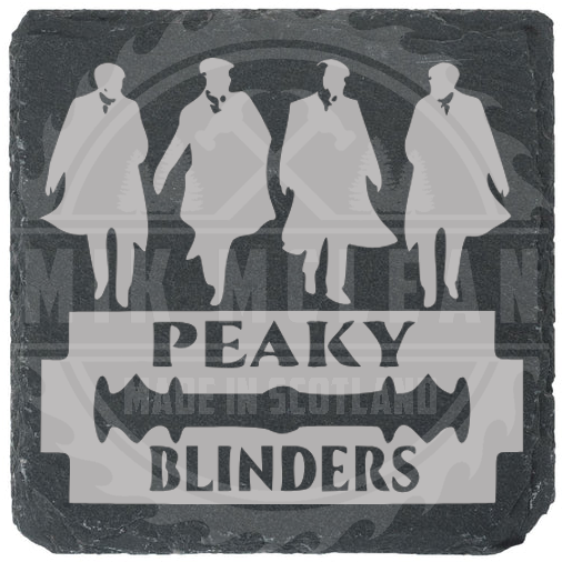 Strike a pose with this artisan-engraved 100mm square slate coaster from Mik McLean. Featuring four silhouetted figures and the iconic razor blade logo, this design pays homage to the Peaky Blinders — sharp minds, sharper style.